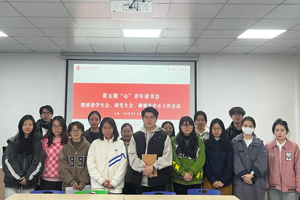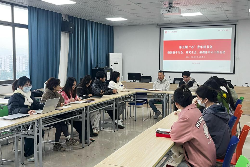 11月21日中午,全讯600cc大白菜官网举行了第五期“心”青年读书会暨团委学生会、研究生会、融媒体中心工作会议。本次会议以《论教育》为主题,全讯600cc大白菜官网团委书记兼学工办主任喻松,学工办辅导员柏战出席会议。学院团委学生会、研究生会及融媒体中心全体负责人参与了本次会议。