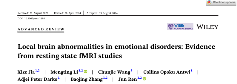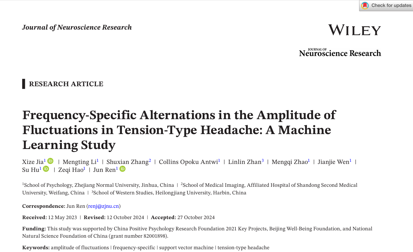 近期,全讯600cc大白菜官网任俊教授和贾熙泽教授分别在Wiley Interdisciplinary Reviews-Cognitive Science(中科院二区)和Journal of Neuroscience Research(中科院三区)期刊发表了题为Local brain abnormalities in emotional disorders: Evidence from resting state fMRI studies和Frequency- Specific Alternations in the Amplitude of Fluctuations in Tension- Type Headache: A Machine Learning Study的学术论文。贾熙泽为论文的第一作者,任俊教授为通讯作者,两项研究均得到了国家青年自然科学基金(82001898)的资助。论文来源:Jia, X., Li, M., Wang, C., Antwi, C. O., Darko, A. P., Zhang, B., & Ren, J. (2024). Local brain abnormalities in emotional disorders: Evidence from resting state fMRI studies. WIREs Cognitive Science, 15(6), e1694. https://doi.org/10.1002/wcs.1694Jia, X., Li, M., Zhang, S., Antwi, C. O., Zhan, L., Zhao, M., Wen, J., Hu, S., Hao, Z., & Ren, J. (2024). Frequency-Specific Alternations in the Amplitude of Fluctuations in Tension-Type Headache: A Machine Learning Study. Journal of Neuroscience Research, 102(11), e25398. https://doi.org/10.1002/jnr.25398