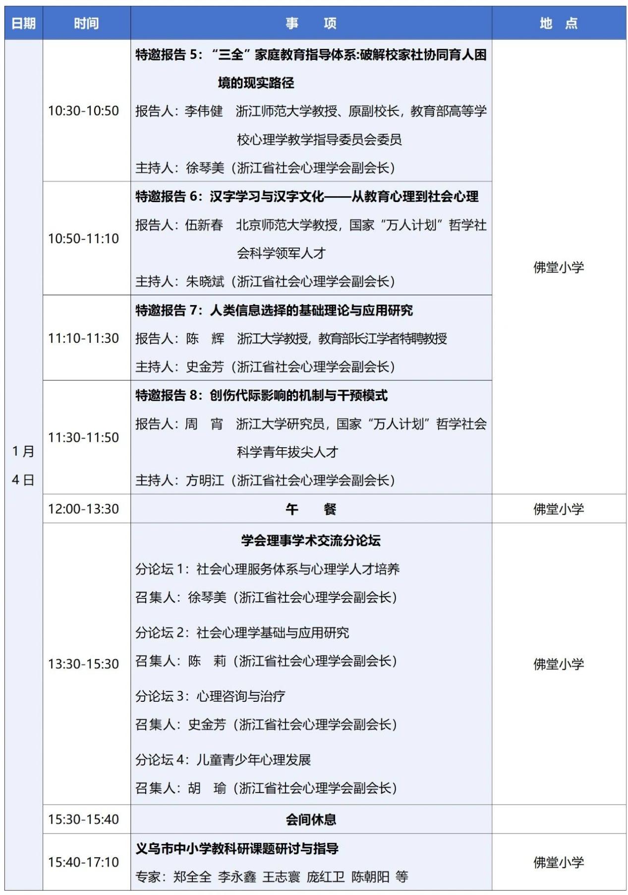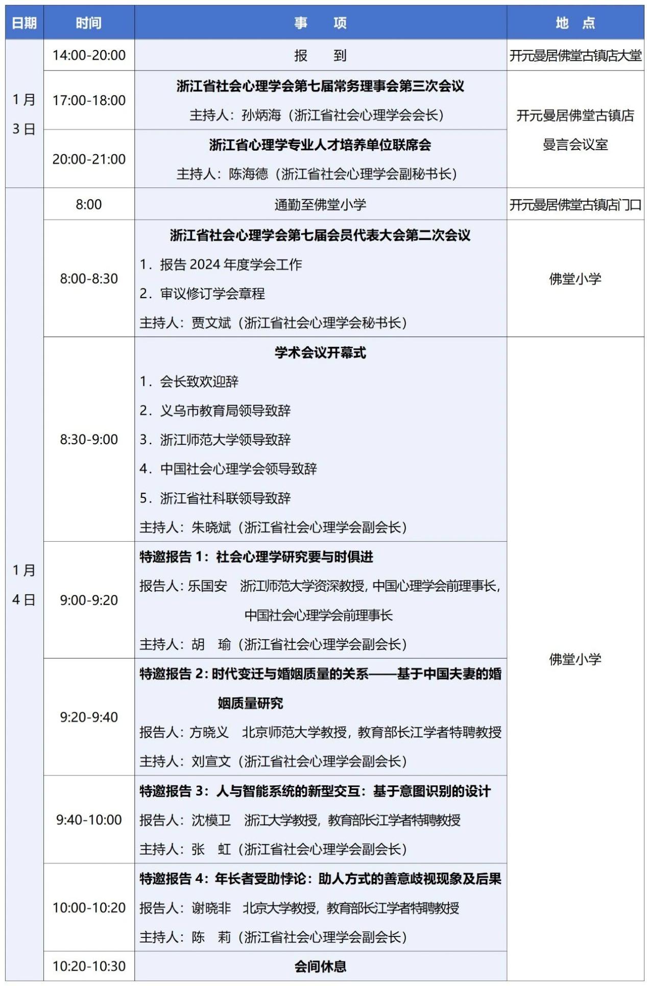 浙江省社会心理学会2024年学术会议暨浙江省心理学专业人才培养单位联席会将于2025年1月3日—4日在义乌市佛堂小学举行。大会以“心理学专业人才培养和社会心理服务”为主题,有关会议事宜详情如下。