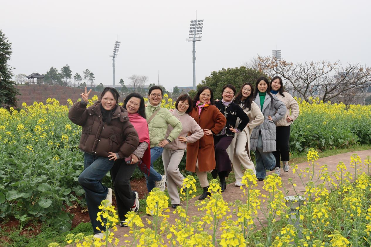"油菜花开'有才华',郁金香绽'愈心香'!" 女神老师们悠然漫步在油菜花田与郁金香花圃之间,在这如诗如画的美景中合影留念。