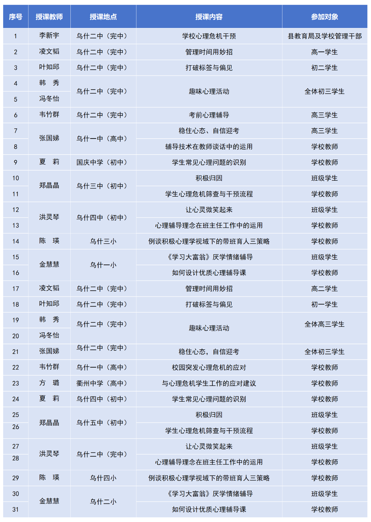 支教团延续了“全学段·全学校·全覆盖”的服务模式,针对中小学不同学段的老师和学生,开展了形式多样的心理健康专题讲座与团辅课程: