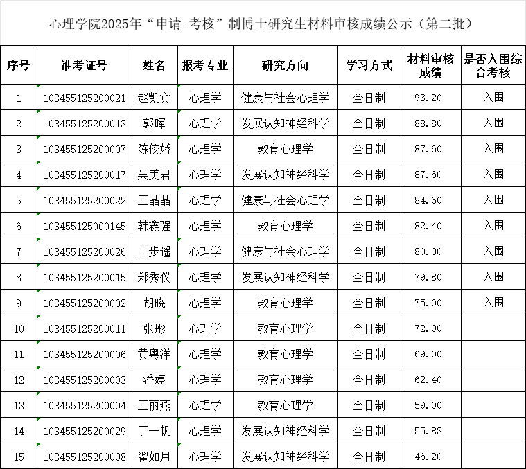 根据全讯800cc大白菜心理学院2025年学术学位博士研究生“申请-考核”制招生实施办法,经学院研究生招生工作领导小组审议,现将材料审核成绩予以公示。