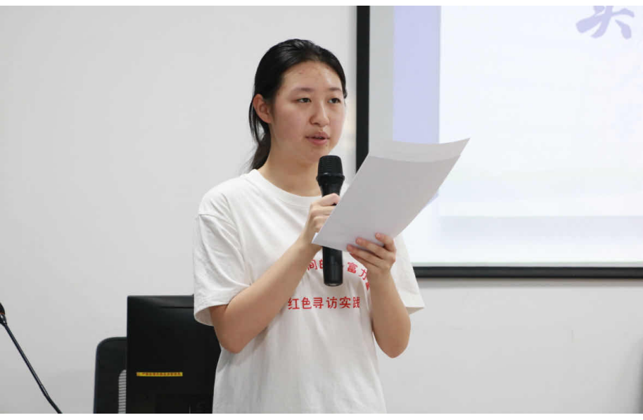 黄昕同学作为实践队代表进行发言,她提出暑期社会实践是大学生练就过人本领的火热熔炉,实践队员必将坚持知行合一,注重在实践中学真知、悟真谛,加强磨炼、增长本领,成为心怀家国、挺膺担当的新时代青年。